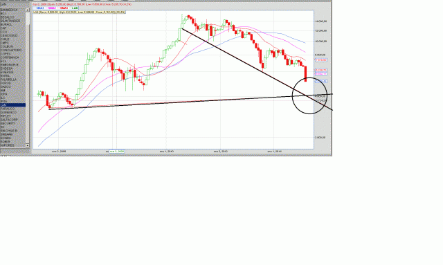 No hay  mucho análisis  que  hacer, si compras  Lan  compras  Brasil, y debes  saber  que  a  Dilma  se le  puso  negra  la  cosa y a Lan también.Los  resultados   tuvieron  una  lectura  optimista y   dio  su  rebote  pero  las  pésimas  expectativas de Brasil   se  impusieron.Y  estamos  camino a  las   cinco lucas, y  volvemos  a hablar  de los  posibles  soportes que puedan  detener  esta  caída.