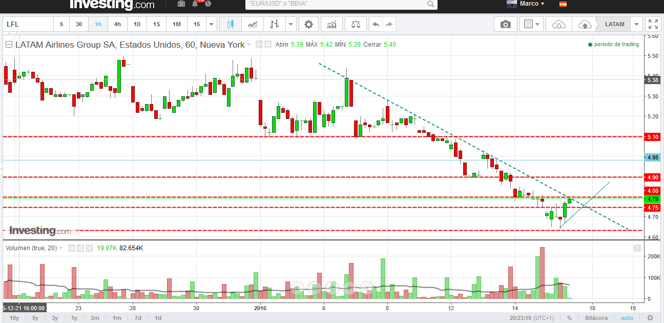 Estuvo lateralizando bastante tiempo y desde el 6 de este mes empezo una clara tendencia bajista y no ha logrado hacer piso, tal vez un punto de entrada sea el rompimiento de esta linea de tendencia bajista, podría ser un indicio de querer hacer base y querer rebotar, la sigo mirando de cerca porque ha mostrado que cuando rebota deja bastante leche , saludos