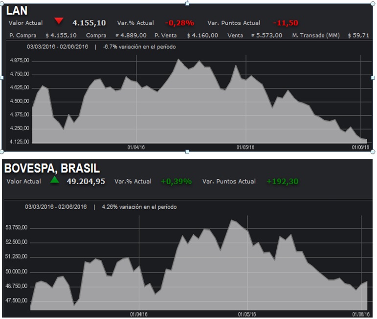 Si durante el mismo período 03/03/2016 a 02/06/2014 Lan renta -6,7 % y Bovespa +4,26 %. No veo igualdad ni correlación por ninguna parte.