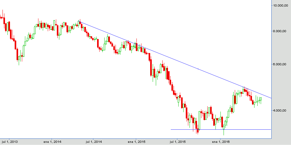 Interesante, tuvo una corrección desde fines de Abril, hasta fines de mayo, donde marcó el low de ésta (+- $4.150), lo cual coincidió con los high de fines de noviembre del 2015 y mediados de febrero del 2016, es decir, lo que antes fue resistencia, ahora fue soporte... De ahí ha venido lateralizando, pero en cada mini corrección, (dentro de la lateralidad) el low ha sido superior, eso me indica que la fuerza compradora se está tomando el papel. Pero tampoco ha logrado llegar muy lejos, la barrera de apróx $4.600 sigue viva... Ahora vamos de nuevo por ella, que la tercera sea la vencida ![]()