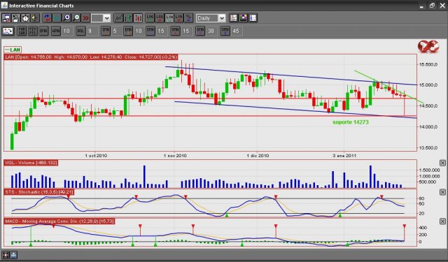 La pregunta es si este es el caballo mas rápido para esperar el rebote, otras como cenco han caido un 12 % y no hay ningún ruido que le ponga techo , yo por mi parte hoy vendí la mitad de Lan y compre Cenco y Falabella, creo que es poisble que LAn entre a lateralizar más que reobtar demasiado fuerte. Que opinan?