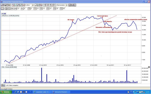 Ø Lan reportó débiles resultados para el 2T11, impactado por eventos operacionales y no recurrentes, que implicaron una caída de 20,3% en el Ebitda y de 73,7% en la utilidad. Si bien en términos operacionales los resultados estuvieron en línea con las estimaciones de mercado, la utilidad estuvo sustancialmente por debajo de lo esperado, por lo que no descartamos una caída en el precio de la acción a raíz de lo anterior.