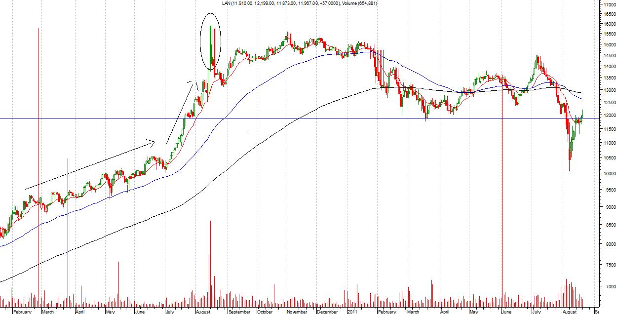 El dia previo a dicha fusion la accion valia 13900, El dia Lunes el apertura fue con un gap alcista hasta lo 15900 poco mas de 14 %, el prblema fue que desde ese momento la accion comenzo el intra bajista que la llevo a cerrar en rojo el dia, en 14114. En todo caso la fuerte alza previa de semanas de LAN ya anunciaba q algo estaba pasando en la empresa. Asi llegado el dia del anuncio salieron a hacer la utilidad.