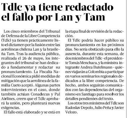 El mercado está expectante ante la resolución que por estos días el Tribunal de Defensa de la Libre Competencia (TDLC) debe entregar sobre la fusión entre la aerolínea controlada por los Cueto, Lan, con la brasilera Tam. Hace dos semanas el Tribunal Constitucional (TC) desestimó una presentación hecha por Pal Airlines, controlada por la familia Mussiet.