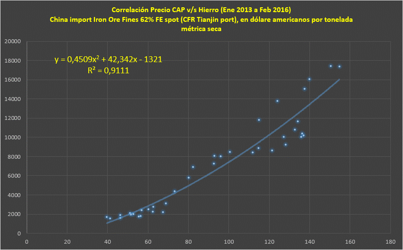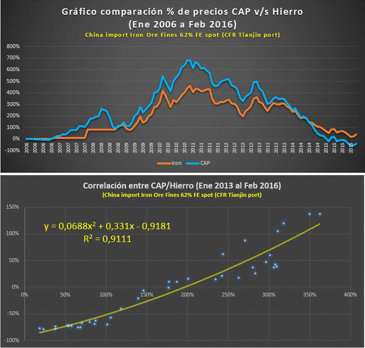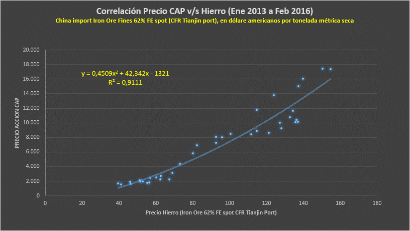 Se ve una perfecta correlación del 91% en el rango que va desde el año 2013 a Feb de 2016, por otro lado se aprecia que CAP ha bajado proporcionalmente más que el Hierro, habría que comparar con otros tipos yo utilice : China import Iron Ore Fines 62% FE spot (CFR Tianjin port) en Dólares americanos por tonelada métrica seca, lamentablemente no tengo el historial de otros tipos de hierro disponible.