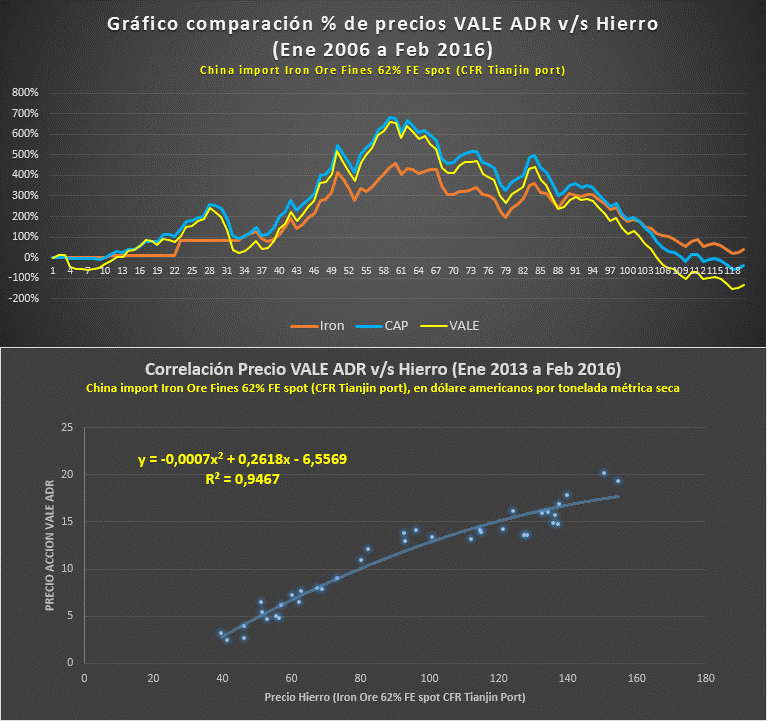 Aquí les dejo la comparación con el ADR de VALE, más castigada la cual presenta una correlación del 94% con respecto al hierro, mayor que CAP.