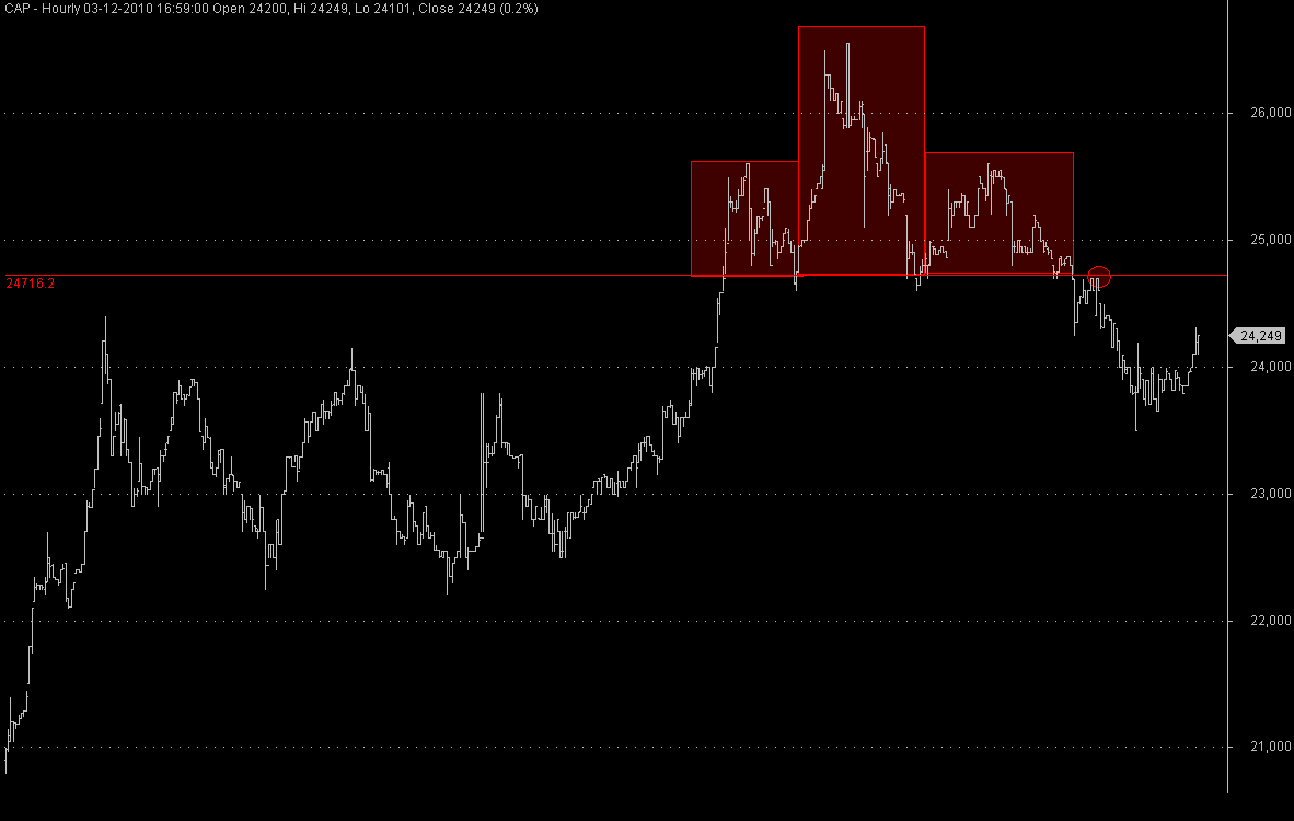 Parece que se dio algo muy parecido a lo que describirte ( tres veces subiò y tres veces bajò) y finalmente rompio a la baja el soporte de $ 25.000. Es de esperar que ahora el soporte de $ 24.000 aguante.
