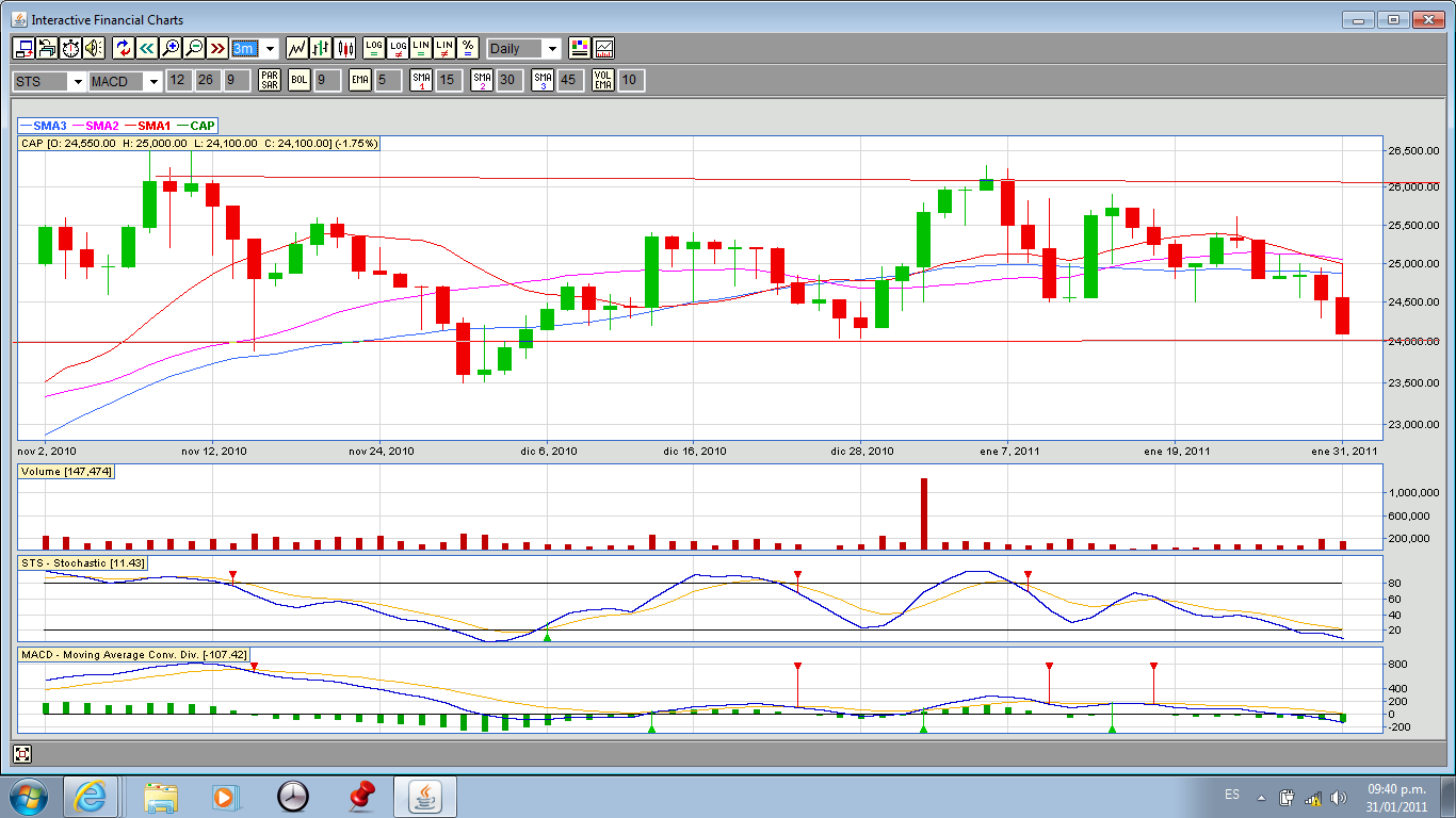 Marmaja, hoy quede con muchas dudas , la acción quedo en la mitad del canal, en la tarde los $25.000.- fueron una resistencia dura, toda la fuerza se dió hasta las 11:00 aproximadamente ($25.100.-), en ese momento no vendí porque la ví directo hasta su resistencia, al final me salí en los 24.990.- con un 2.6% de ganancia, con el resguardo de no perder lo poco ganado. En todo caso estoy atento al reingreso para mañana, estoy convencido que el IPSA determina mucho la dirección de esta empresa.