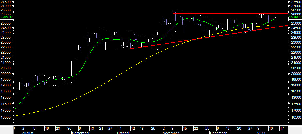 Hace una hora atras me dí cuenta del error que cometí, vi el canal como una paralela y no como un canal ascendente, a pesar de que no tengo ningún estudio técnico me moleste por no darme cuenta que la linea de tendencia me debía dar la entrada en lo $24.500 y no en los $24.200.- como yo esperaba, en fín esta vez no pude entrar y en este momento no es apropiado, esperaré que defina un rompimiento de resestencia o una nueva busqueda de su soporte dentro de un mercado con condiciones normales.