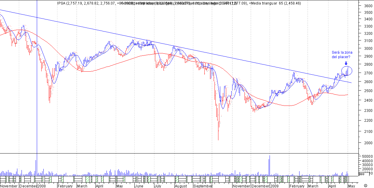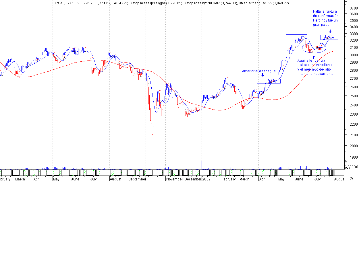 La verdad es que yo siempre espero que las resistencias se rompan cuando hay una reacción al alza del ipsa, especialmente cuando el precio está en la resistencia el primer día de alza...especialmente cuando durante la corrección el precio en vez de bajar a la parte baja del canal se queda coqueteando con sus máximos... en especial cuando hay una subida violenta... en especial cuando hay máximos que no se rompían en mucho tiempo....