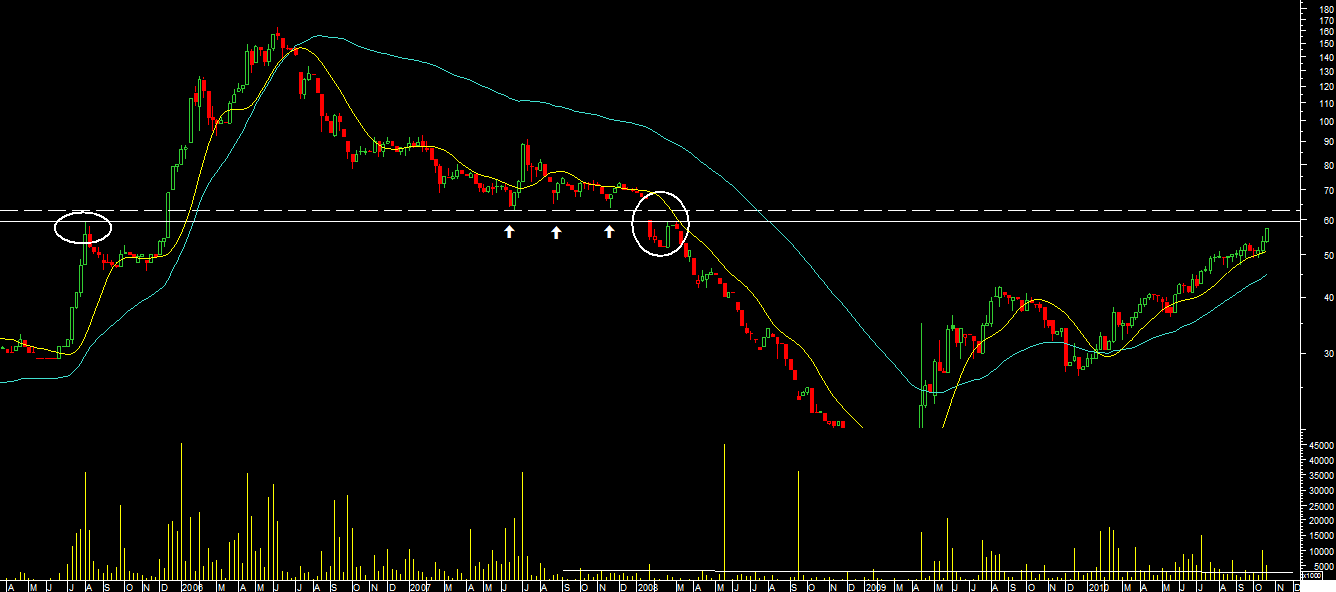Como pueden ver, lo ocurrido esta ultima semana, salir del canal lateral y aumento de volumen han puesto a este papel (al igual que a Iansa) en una posición de lujo para dar grandes retornos. Pero, mirando la gráfica hay dos puntos que pueden generar conflicto en el ascenso. El primero de ellos data de Sept 2004...hace haaarto tiempo...es cierto...bastante como para recien después de 5 años volver a acercarse, por debajo, pero que solo fue una pausa que dio lugar a el mejor periodo de Campos. Luego, pero con caracteristicas de desastre es a comienzos de 2008, donde comenzó la Gran Caida Libre de Iansa...todo el 2008. Esta caida comenzó en niveles similares de la resistencia anteriormente comentada (Sept 2004) y que es cercana a los $60.