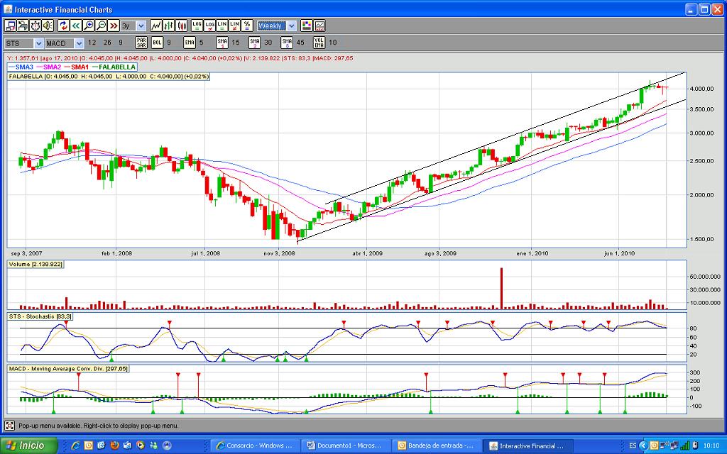 En mi opinión, este papel se encuentra en zona de indefinición, intentando afirmarse sobre su MM de CP. Está luchando desde hace un rato entres los 4.020 - 4.080, transitando por la parte alta del canal de LP que trae desde el punto más bajo de la crisis 2008, fines de noviembre. Por lo mismo ha lateralizado desde hace una buena cantidad de sesiones. Cosa similar le ocurrió cuando no lograba traspasar la barrera de los 3.000 hace algunos meses.