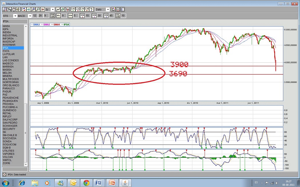 Esperemos que sea lento, pq la caida anterior del IPSA (crisis subprime) empezó en Diciembre 2007 y terminó aproximadamente en Mayo de 2009, es decir 1 año y medio (Considerando el cruce de TMA13 y TMA65 semanal).
