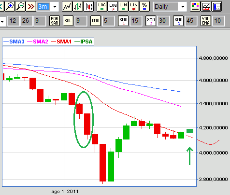 En cuanto al día de mañana, por el comportamiento de los índices de USA, el oro y la plata en las últimas horas, me parece bastante probable que abramos al alza acá, y que al menos no cerremos con una baja. Sólo con eso, la velita entera del IPSA se ubicará por encima de la SMA1 (15 días) ya que ésta, por lo dicho anteriormente, seguirá bajando. El efecto visual nos dará al menos una sonrisa momentánea.