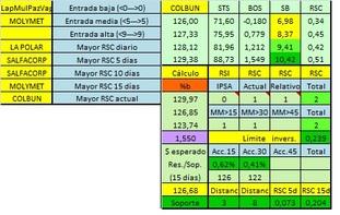 Si lo hacemos un poco mas histórico y suavizado para eliminar la volatilidad, los resultados se pueden apreciar en el recuadro izquierdo, mientras que en el recuadro derecho, que muestra la "estrella del momento" COLBUN, se aprecian otros datos que pueden tener algún grado de importancia, como si se encuentran bajo o sobre las MM 15 y MM 30; distancia en $ de ellas, % de aceleración respecto del día anterior, precio proyectado según este mismo parámetro, cálculo de %b, y en desarrollo, puntajes de acumulación según criterios respecto a las MM, y RSC entre otras.