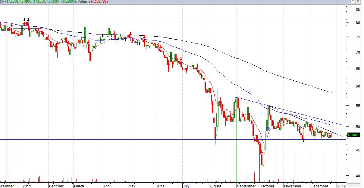 De hecho este papel, sólo en 2 sesiones en los últimos 6 años ha estado por debajo de $ 44 (4 y 5 de Octubre de 2011). Seguramente, la entrega de sus resultados gatillará el próximo movimiento. Sí el 4to T anda bien, no habrían más razones para que continuara deprimida