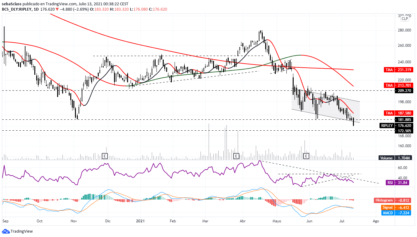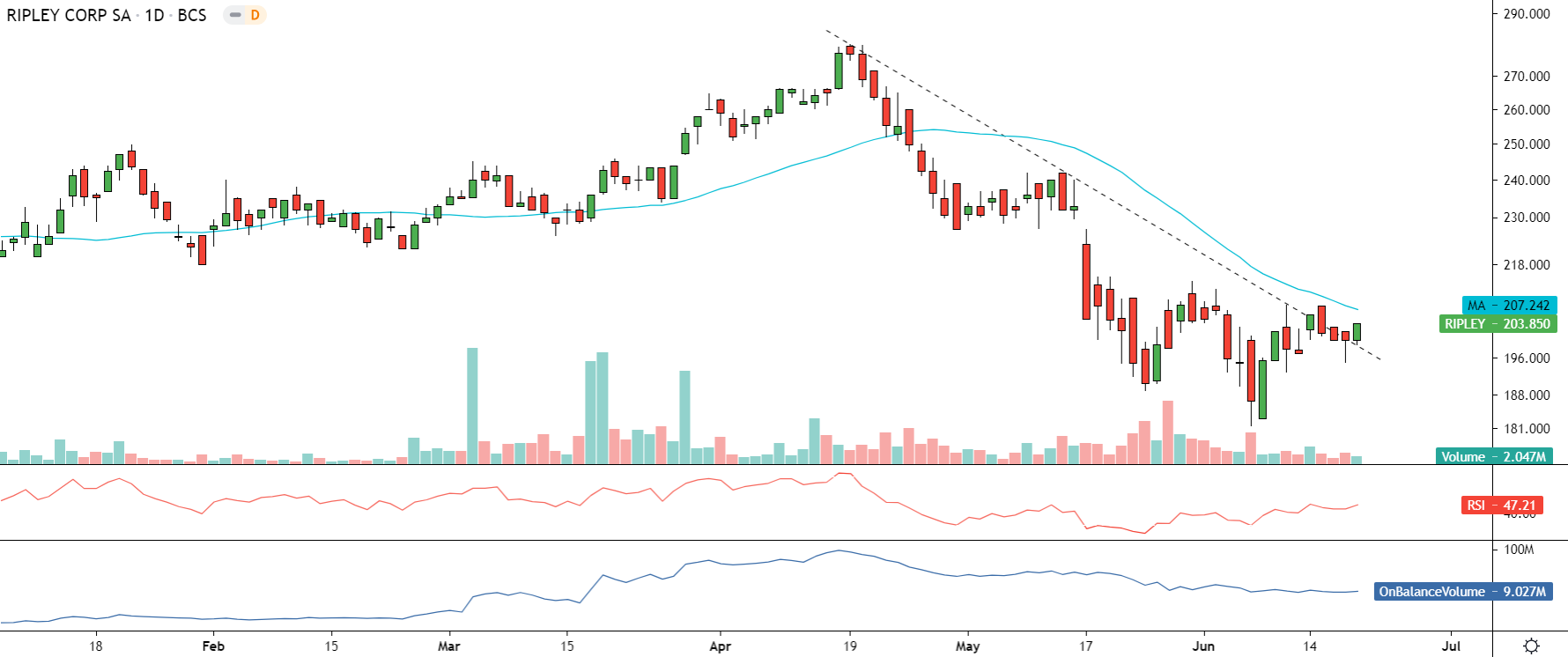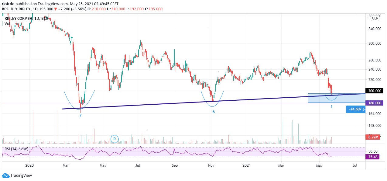 A contar del 26 de marzo, Ripley tomó una senda mucho más acelerada al alza, pero luego cayó el 19 de abril para incorporarse a su antiguo canal alcista que venia siguiendo. Sin embargo, no aguantó con el panorama actual y perdió un poco el canal. Ahora pareciera ser que lo quiere retomar nuevamente.