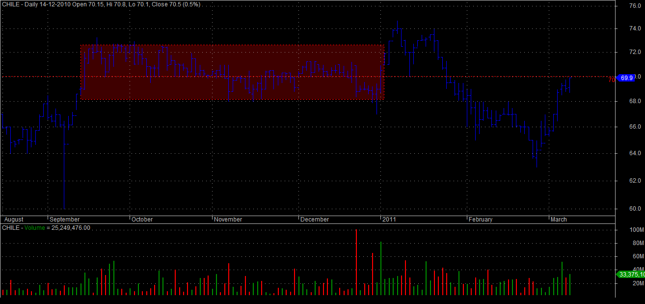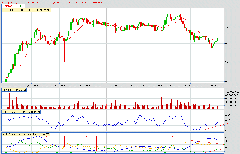 Interesante movimiento de CHILE, precio ascendente, volumen ascedente 3 últimas jornadas, traspasando resistencia de $66, fuerza tornandose compradora de acuerdo al Bop, DI + ascendiendo levemente, rompiendo directriz bajista iniciada a mediados de enero. Ojo que entrega dividendos con fecha límite 11/03 http://www.banchileinversiones.cl/porta … ema=PORTAL.