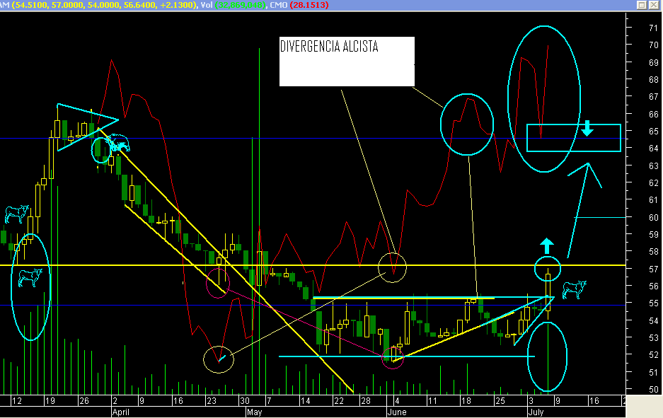 El volúmen habla por sí sólo... el mayor desde inicio de mayo + ruptura de canal lateral = Sentimiento alcista muy fuerte. Personalmente me planteo objetivos en $60 y $64 (o hasta que haya un reversal). Además hay una divergencia alcista en el oscilador.