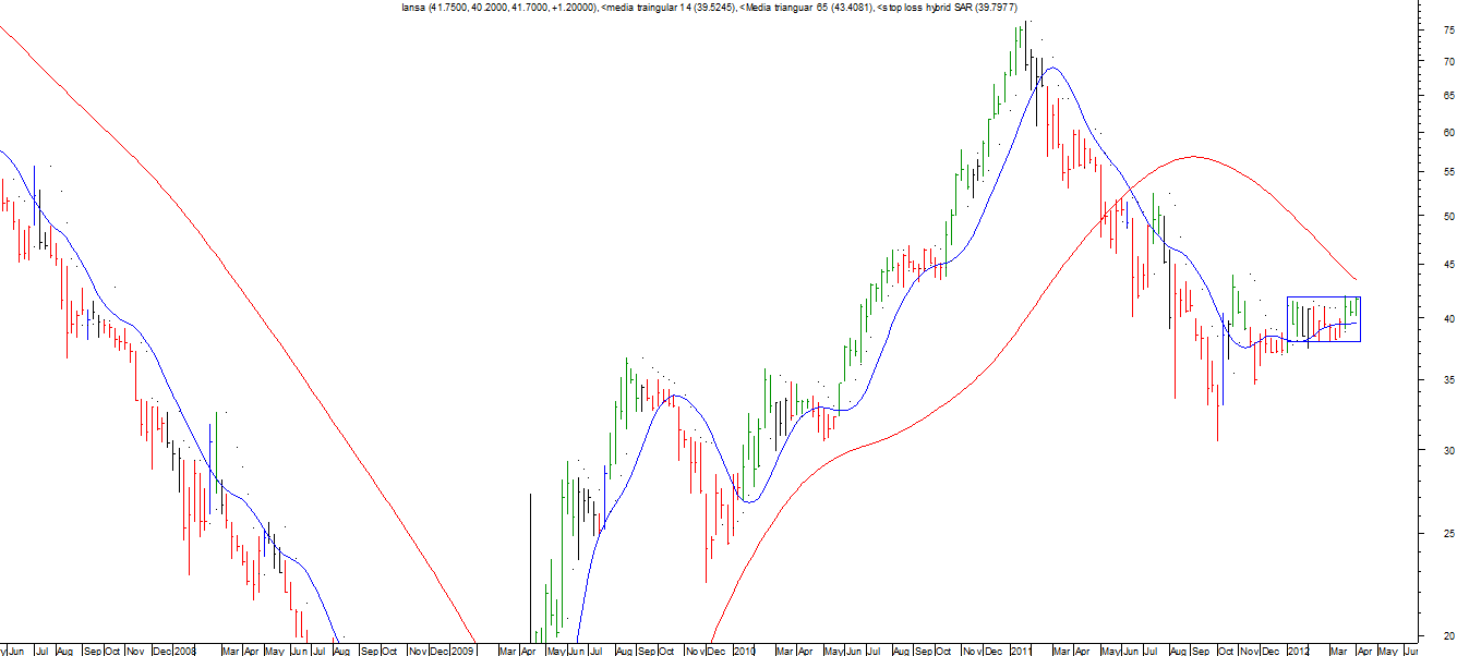 A mi parecer, se conjugan algunos factores que podrían hacer que la acción vaya al alza: Se produjo un triple spring dado por el BOS (40,199); la MM15 (40,254); y la línea de tendencia bajista, que la cruza en app. 40,3.