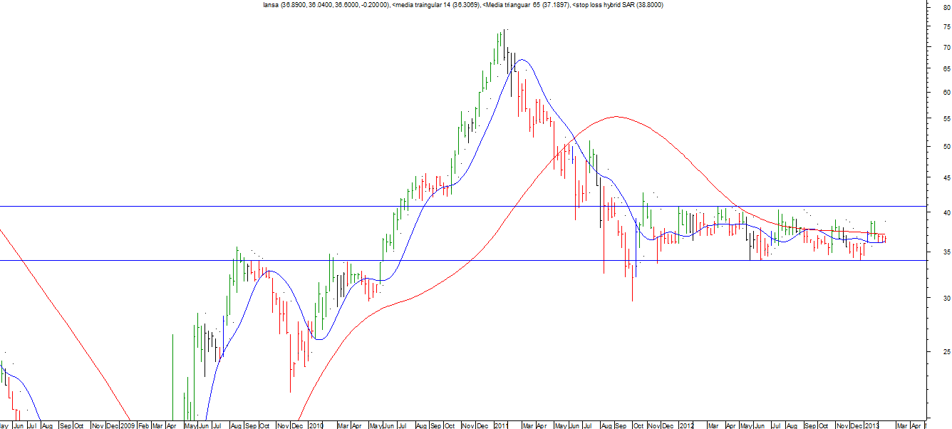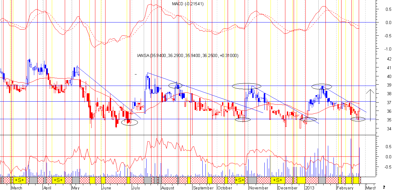 Hola Eduardo, tratando de contestar tu pregunta, adjunto gráfica de Iansa, quizas seguirá el curso de las dos veces anteriores que una vez llegado al soporte vuelve hasta su resistencia ya definida cercana a los $39. Pero hay que estar atentos al mercado, pero ese es el patron que veo en Iansa.