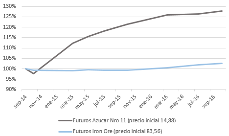 Estimados, una comparativa del precio de futuros de 2 comodities que hoy están por el suelo. Partiendo hoy en base 100 ambos