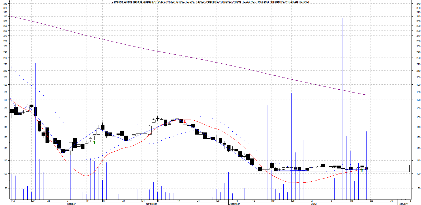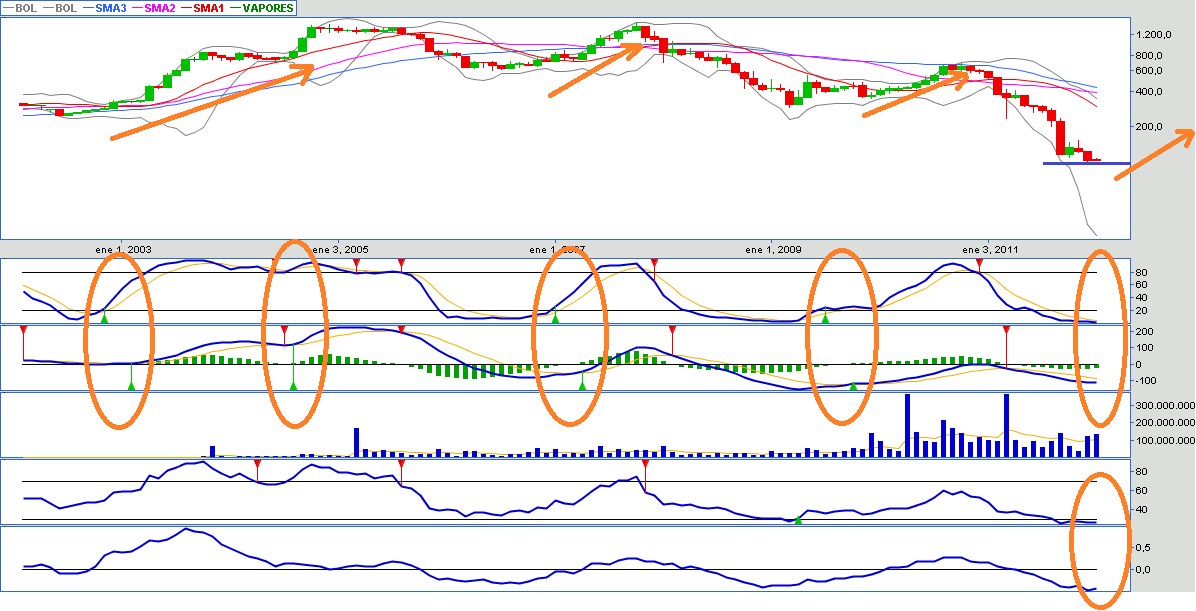 La accion se encuentra en una prolongada tendencia lateral sin embargo despues de mucho tiempo los indicadores técnicos nos señalan ingreso adjunto gráfico con situación de la empresa actualizada; lo anterior es concordante con dos hechos fundametales: El primero de ello el ingremento del 11% de las tarifas navieras de acuerdo al SCFI y que alcanza a un 31% en la ruta más importante del mundo, sin embargo esto valores aún no igualan la situación del año 2010. El segundo motivo tiene relación con la finalización este miércoles del porcentaje de acciones ofrecidas a inversionistas situación que hace presumir a partir del jueves un importante incremento en los precios de la acción ahora solo nos queda esperar que el mercado hable.