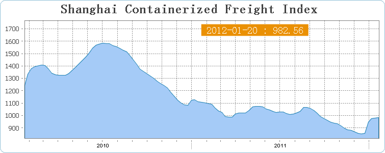 Actualización SCFI nuevo aumento del indice desde US$ 948 fecha de elaboración del artículo precedente que adjunté al foro. Nueva medición al 20 de enero 2012; dato no procesado aún por ninguna publicación económica nacional, aumentado a US$ 982,56 / T en 3,65%.
