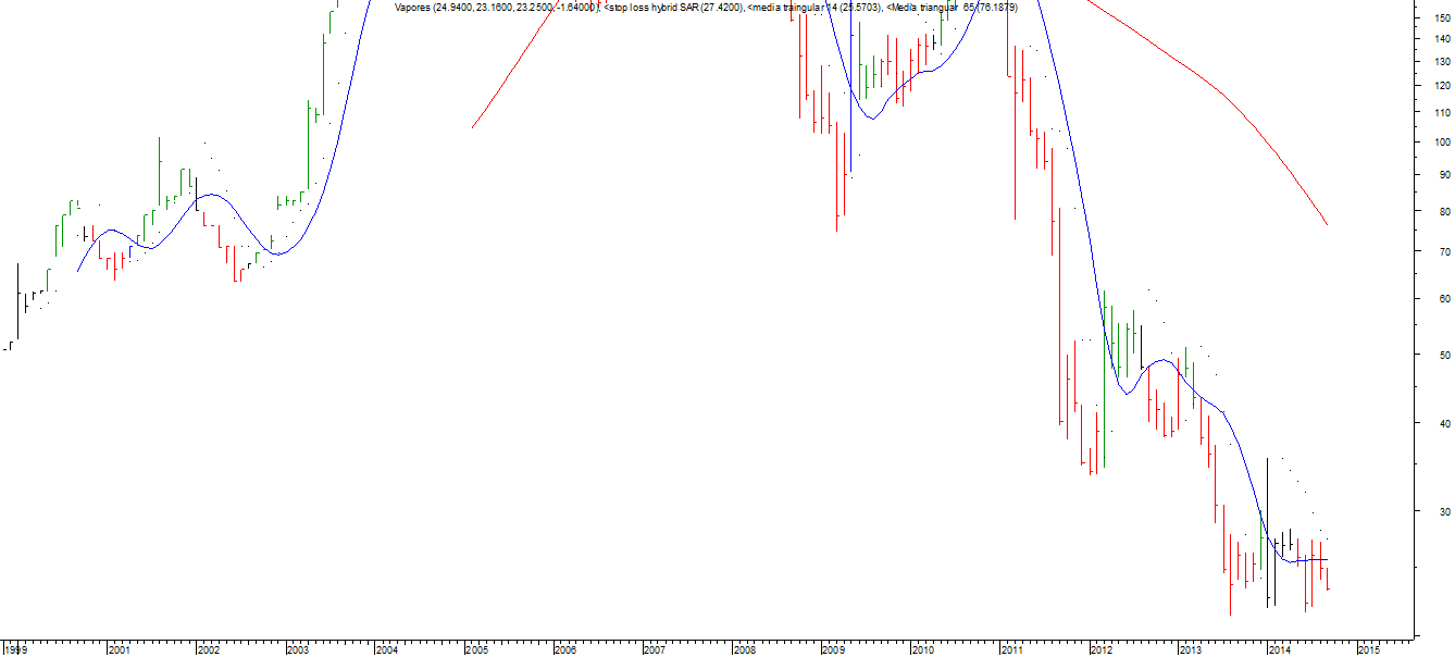 Yo creo que el trading (volumenes y precio) visto de las acciones en ultimos meses está completamente manejado. La acción no tiene liquidez y a L le interesa - antes de la fusión - que acción esté a 75% de Valor libro o mas (o sea sobre 22)... Luego VAPORES container la dejará CAER (será fusionada con HLL) y el mantendrá una acción de VAPORES - NO Containers (Granos y autos) seguramente a precio muy bajo 10...pero viva y listada en mercado chileno