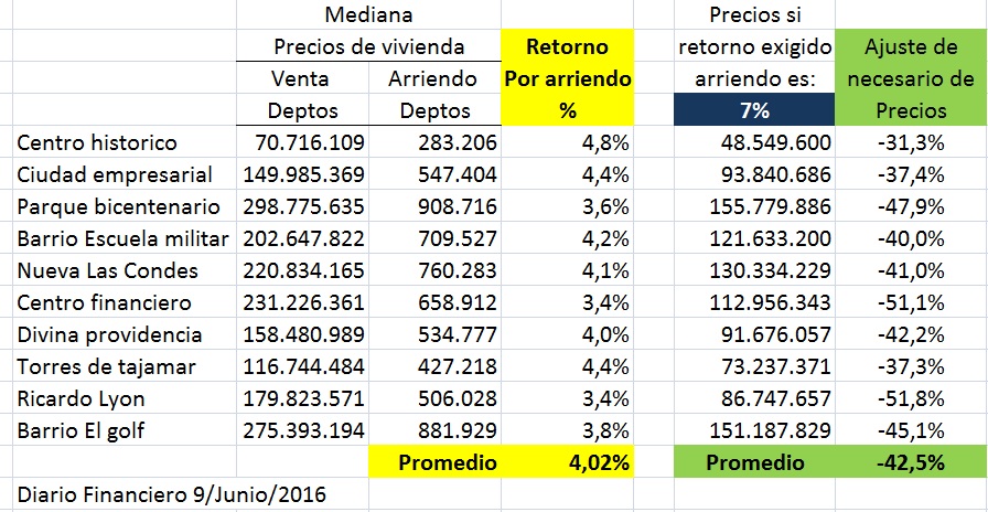 Si la tasa de retorno por arriendos se mueve de 4,02% a una nueva tasa de 7%...entonces cteris paribus...la variable de ajuste tiene que ser el Precio de la vivienda. Para que la ecuacion se de...las casas debieran bajar 42% para restablecer equilibrio.