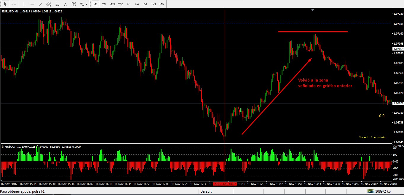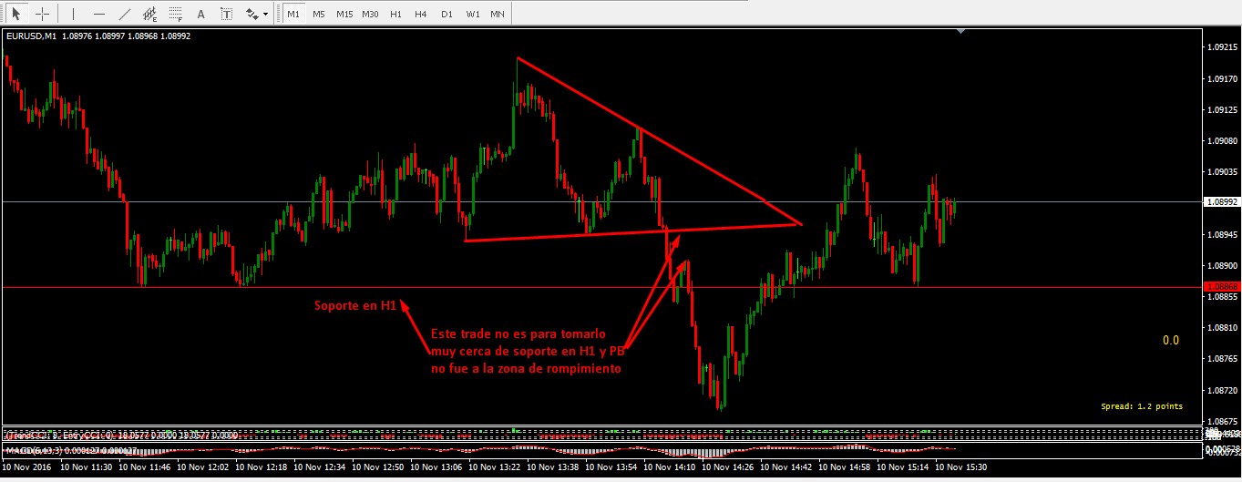 Soporte roto, ahora voy a esperar el patrón, pero en M1, para volver a entrar en modo Sell.