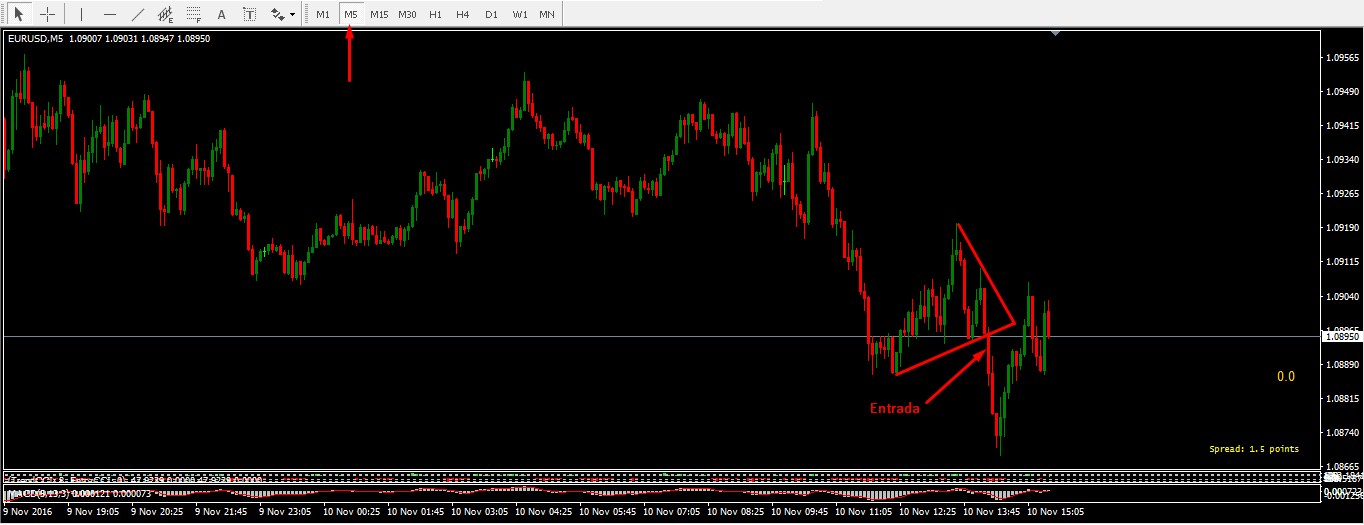 Entrada según patrón en M5, con un profit máx de 50 pips. Ahora otro patrón en formación.