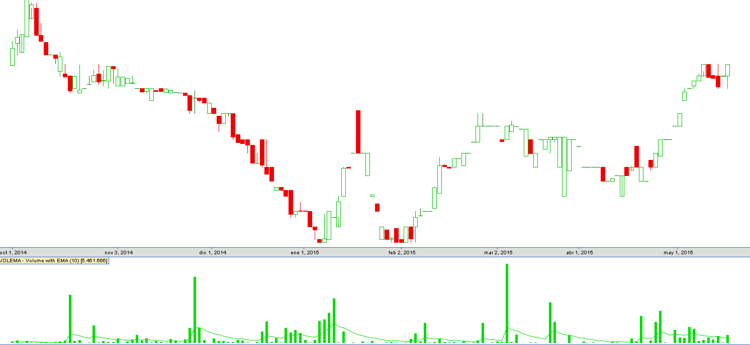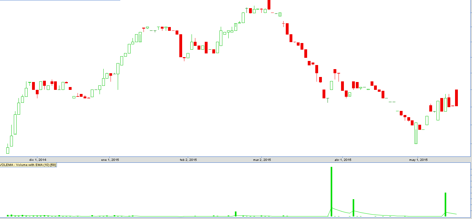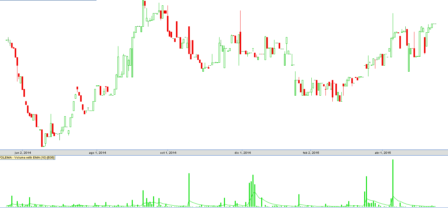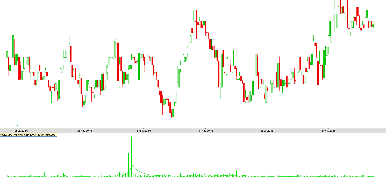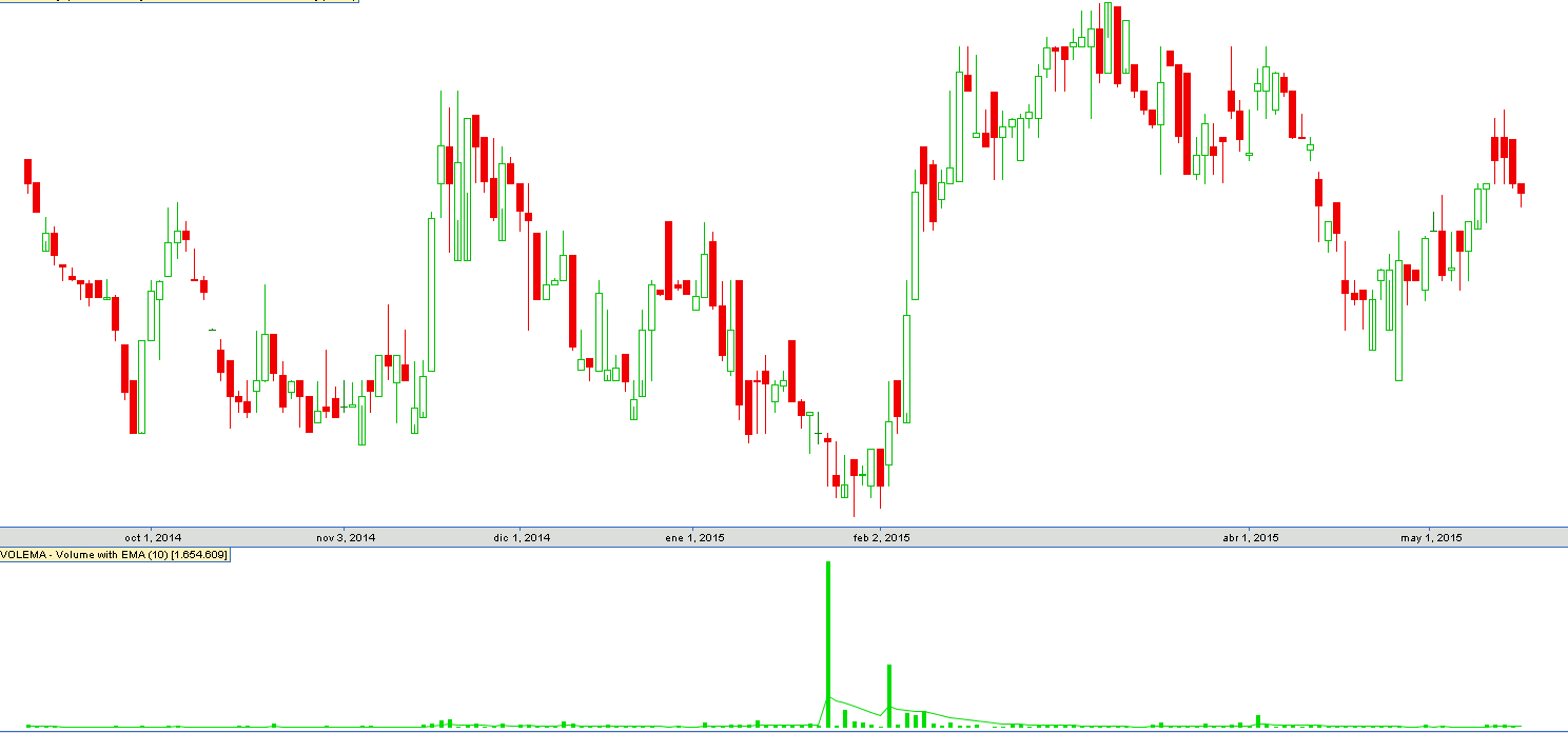 Tiene un soporte marcado, pero hace no mucho intento escaparse al alza y fue frenado por un HCH que le hizo volver a su lugar, nuevamente sin bajar más allá del soporte que tenía. Creo que seguirá por un canal pues también ha marcado techo últimamente, así, creo que sería bueno comprar en el CP hasta que llegue a ese techo y luego evaluar si sigue subiendo o bien vender hasta que vuelva a bajar al soporte que ha tenido últimamente. Más allá no creo poder aventurarme, aunque si tuviese que decir algo, como ha habido volumen sobre todo en las alzas, creo que irá hacia arriba.
