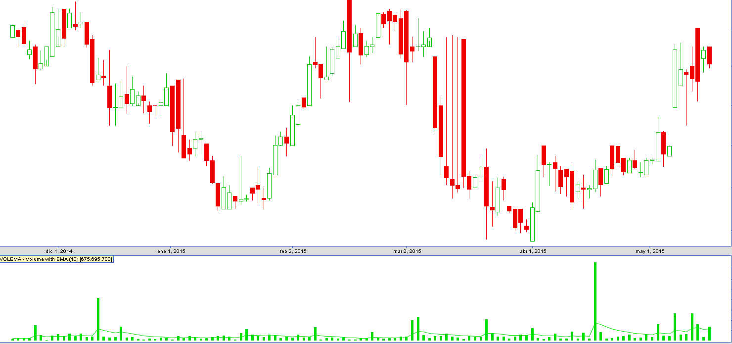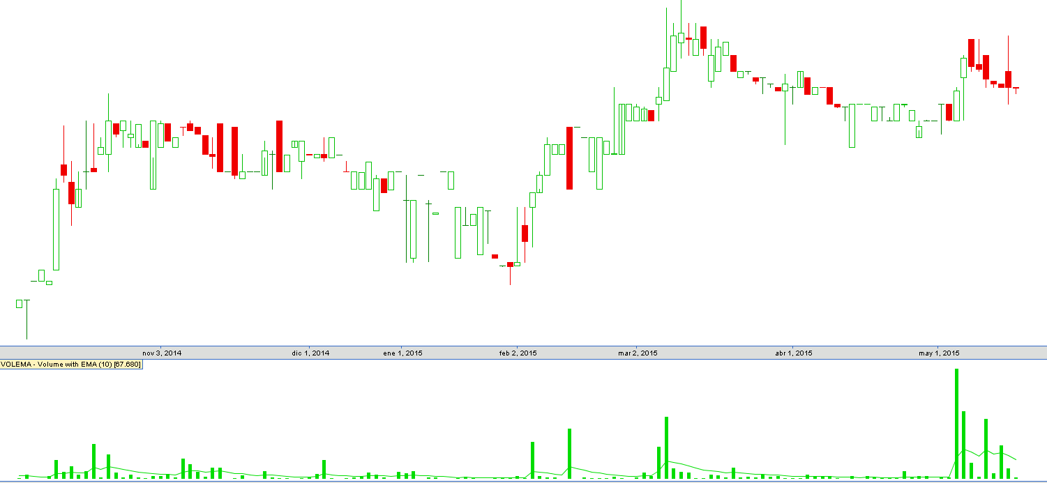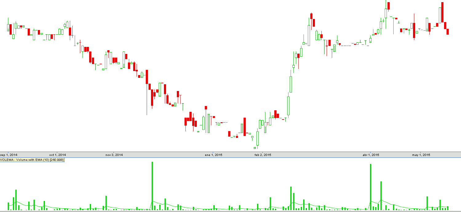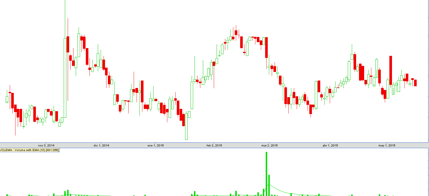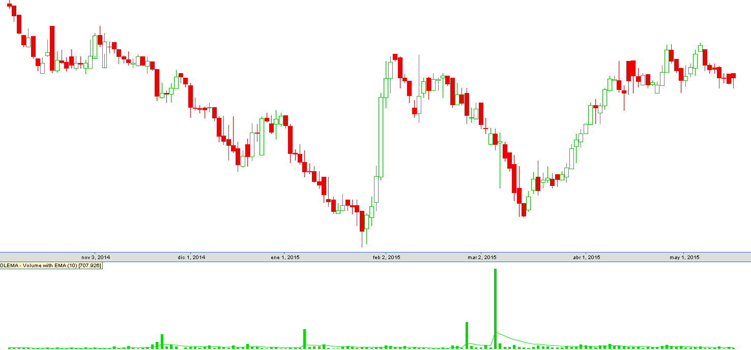 Tiene un soporte marcado, pero hace no mucho intento escaparse al alza y fue frenado por un HCH que le hizo volver a su lugar, nuevamente sin bajar más allá del soporte que tenía. Creo que seguirá por un canal pues también ha marcado techo últimamente, así, creo que sería bueno comprar en el CP hasta que llegue a ese techo y luego evaluar si sigue subiendo o bien vender hasta que vuelva a bajar al soporte que ha tenido últimamente. Más allá no creo poder aventurarme, aunque si tuviese que decir algo, como ha habido volumen sobre todo en las alzas, creo que irá hacia arriba.