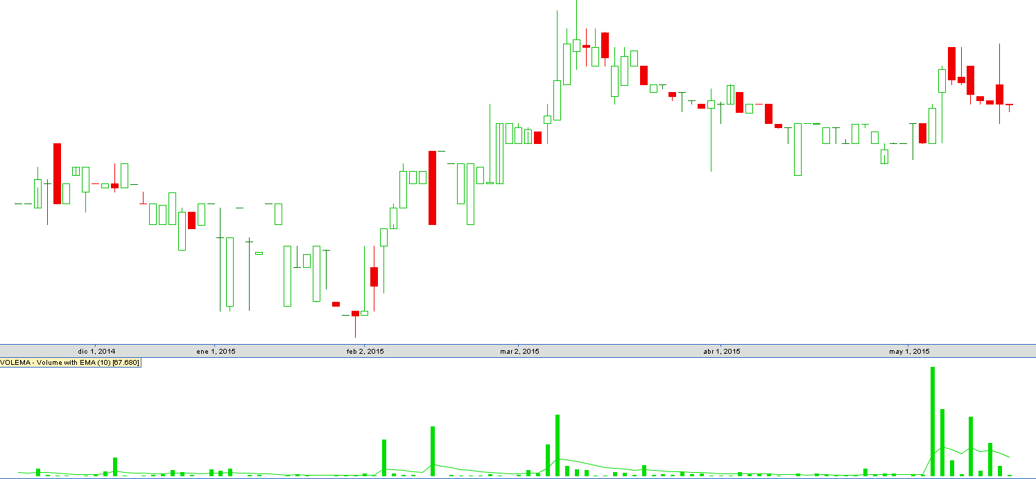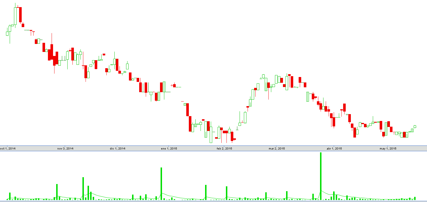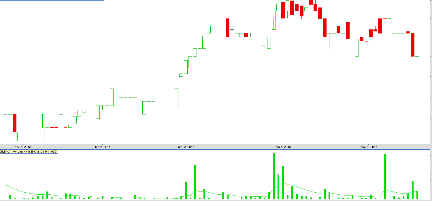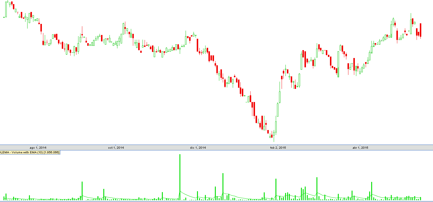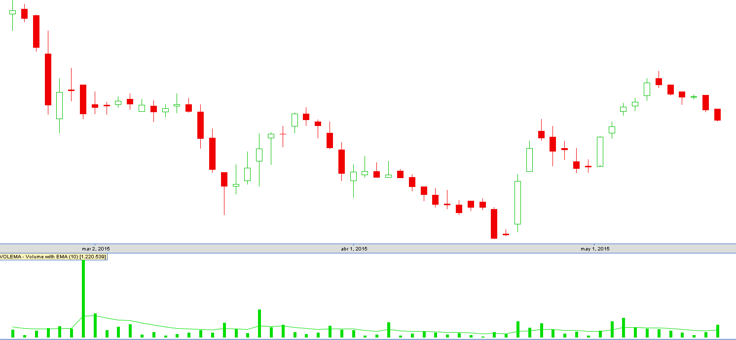 Tiene un soporte marcado, pero hace no mucho intento escaparse al alza y fue frenado por un HCH que le hizo volver a su lugar, nuevamente sin bajar más allá del soporte que tenía. Creo que seguirá por un canal pues también ha marcado techo últimamente, así, creo que sería bueno comprar en el CP hasta que llegue a ese techo y luego evaluar si sigue subiendo o bien vender hasta que vuelva a bajar al soporte que ha tenido últimamente. Más allá no creo poder aventurarme, aunque si tuviese que decir algo, como ha habido volumen sobre todo en las alzas, creo que irá hacia arriba.