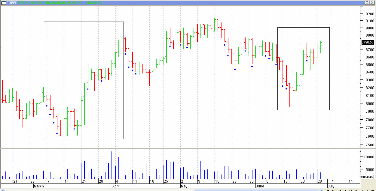 Cuando se ponen lucas y no papeles, el cierre (barrita derecha de la barra eje) es màs pròximo al mìnimo, para luego tener el reversal progresivo y el cierre se comienza a ir hacia el maximo consecutivamente. En la onda actual no veo nada anormal, un simple y comùn movimiento y quizàs menor que el de Marzo. Por cierto falta que tomen beneficios los que entraron en torno a los 8.000/8.200 y el pullback posterior deberà resolver primero las zonas 8.900x y 9.100x antes de los 9.500// Falta bastante paño. Por otro lado todos sabemos lo que le pasa al ipsa cuando se mueve mucho esta blue chip.....