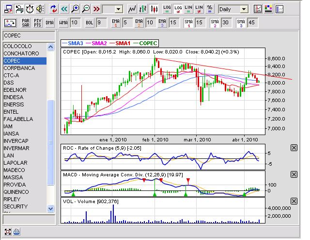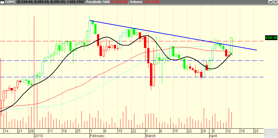 COPEC, el día 04/01 paso sus máximos cercanos (14/10/2009 a 7620), desde ese día no ha parado y si todo sigue así se está encaminando a sus máximos históricos cercanos a 9000 (octubre 2007 a enero del 2008).