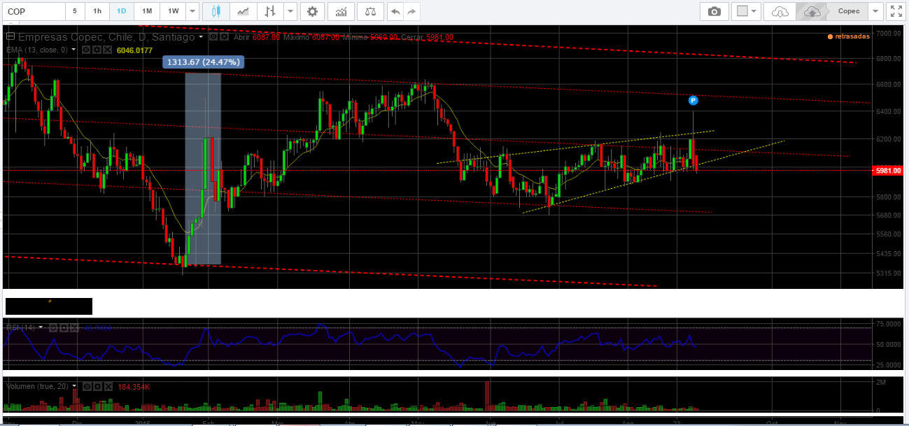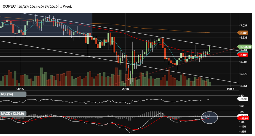 Copec continúa lateralizando en los últimos días, pero en el semanal mantiene una tendencia alcista.