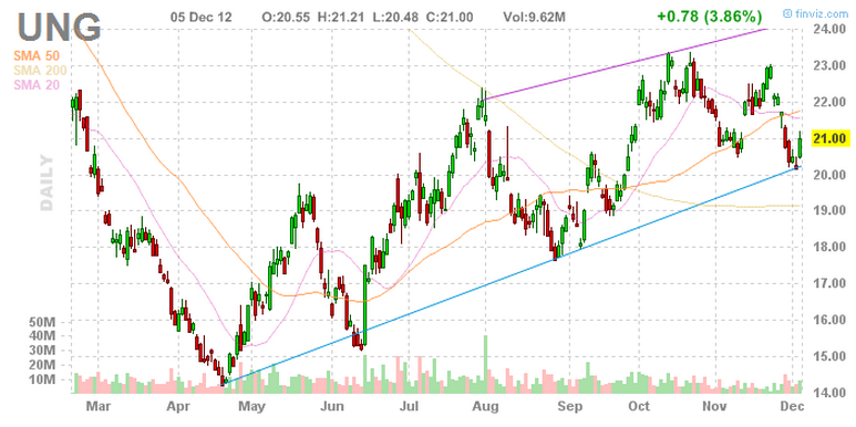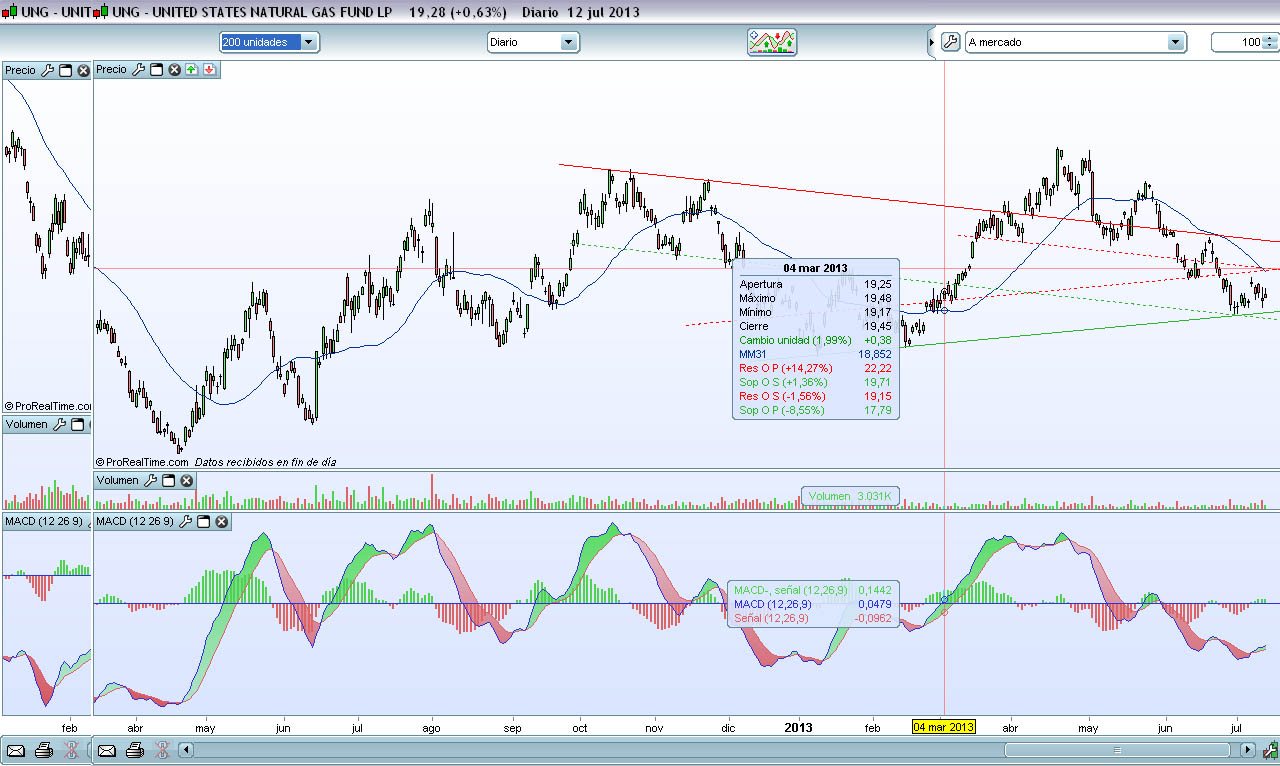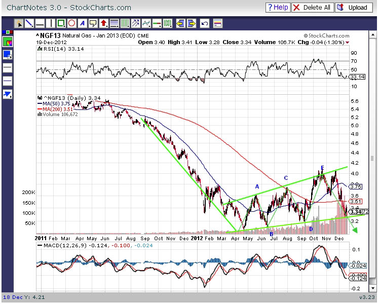 Pero por otro lado, y es aqui donde alguien me podria ayudar, he visto una grafica de los futuros para el Gas. Me sorprende porque al parecer se ha formando un triangulo expansivo, él que al parecer indicaria que los precios irian a la baja.
