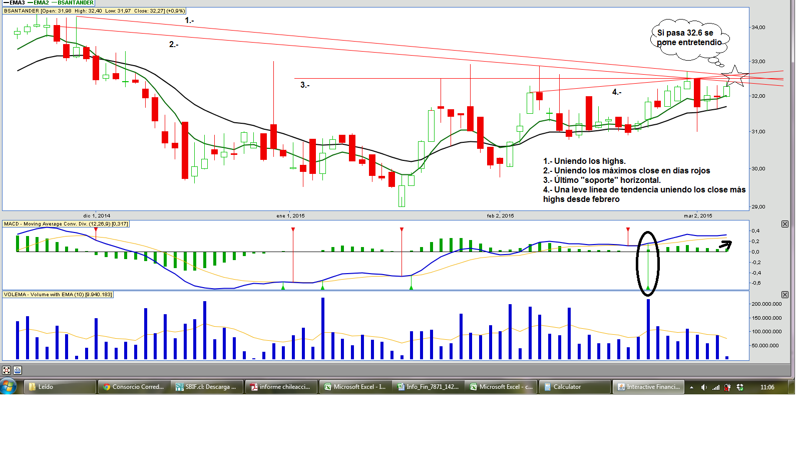 Yo esperaré a ver qué pasa luego del 7 de marzo cuando termine el ciclo de la gráfica que estoy estudiando, hasta esa fecha estimo que seguirá lateralizando en torno a los $31.- El 7 de marzo subiré nuevamente el gráfico actualizado.