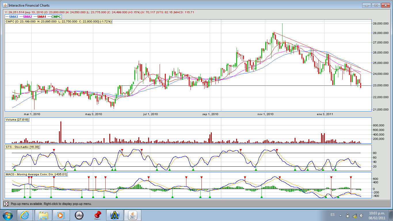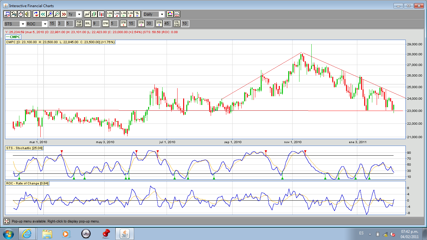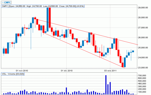 Si observan el gráfico CMPC tiene un encanto con su linea de soporte situada en los $23.000.-, Hasta Junio del año 2010 fue una barrera dura, una resistencia que al ser atravesada se transformo en un punto estratégico, miren cuantas veces a caido hasta este punto y siempre se ha parado y me ha dado más lucas que las que me quitó cuando no la conocía. Aún este IPSA despiadado no ha podido derumbarla, lo que sí preocupa es una linea de tendencia bajista, que esta llebando sus rebotes cada día más cerca de su soporte, este último posible rebote solo debería superar los $24.000 para mantener su tendencia a la baja, ahora si con un posible rebote del IPSA dentro de este mes esta acción logra llegar a los $25.000 yo me atrevería a decir que provocamos un cambio de tendencia. Bueno esta demás decir que compre en los $23000.-, no la subí al track record para no influir a nadie, aunque parece que solo yo y Woodito la seguimos.