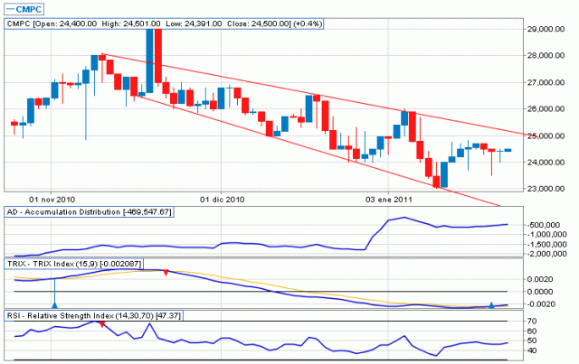 Alguien puede darle un vistazo al gráfico de CMPC con el indicador AD (Acumulació Distribución) y el TRIX.