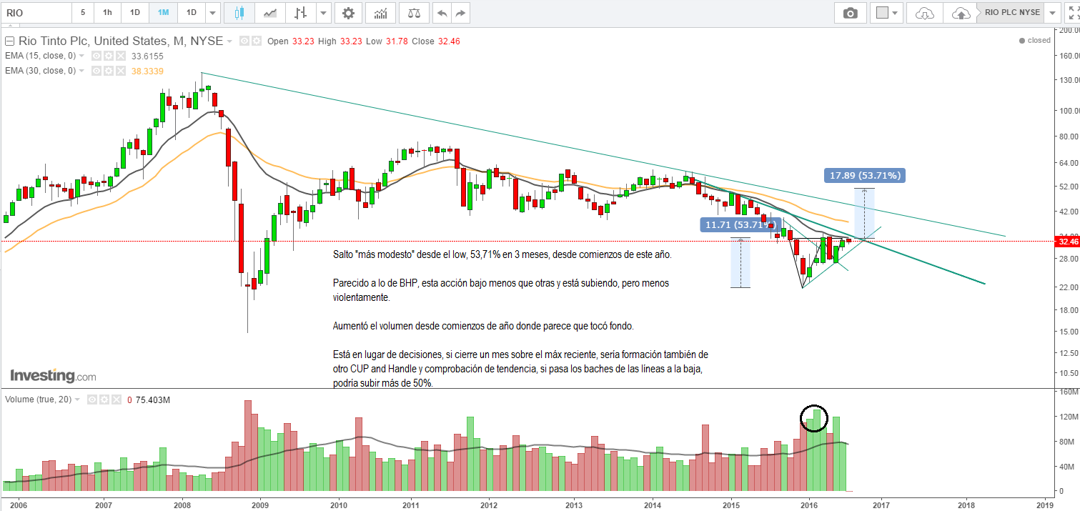 MUY, pero muy parecido a BHP, la diferencia es que a RIO le afectó algo más la crisis del 2008 parece. Ninguna de las dos sería mi caballo, se ven más seguras, pero menos vertiginosas si les toca subir.