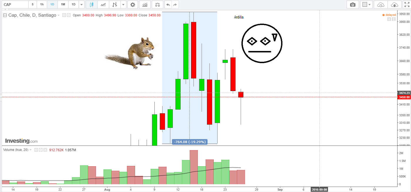 En el monito traté de ver una línea bajista entre el high de 3960 del martes antepasado y el high de 3730 de ayer. También podría ser una resistencia en ese high de 3730 de ayer que de hecho fue el mismo que el de antes de ayer. Para estar algo más seguro, le pediría que tenga un cierre con buen volumen sobre 3730, incluso que se aleje un poco de ahí para recontraconfirmarlo tipo 3750 o 3800, incluso, podría pedírsele ver el día siguiente a eso a ver si sigue subiendo o nos está jugando una mala pasada de nuevo.