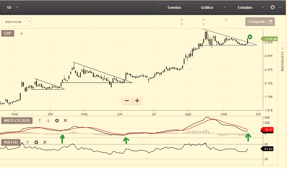 Tirando líneas, CAP hoy en diario (que es la temporalidad que uso para trading) rompio el triángulo (con volumen respetable y buena vela) que venía formando desde el último high. En todas las ocasiones anteriores ha subido intentando probar el último máximo que esta del orden de $3.900.- un buen upside para trading. Para mi hoy fue IN a mercado, SL $3.300.- (sólida base ya testeada), PT: $3.900.-