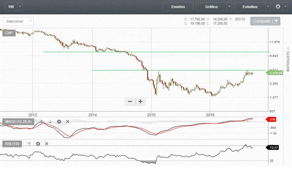 Creo que ambos tienen razón, si lo miramos de diferentes horizontes de inversión. Si estamos pensando a largo plazo yo no pondría mi dinero en CAP por lo menos hasta que pase las resistencias que señala Maragume.