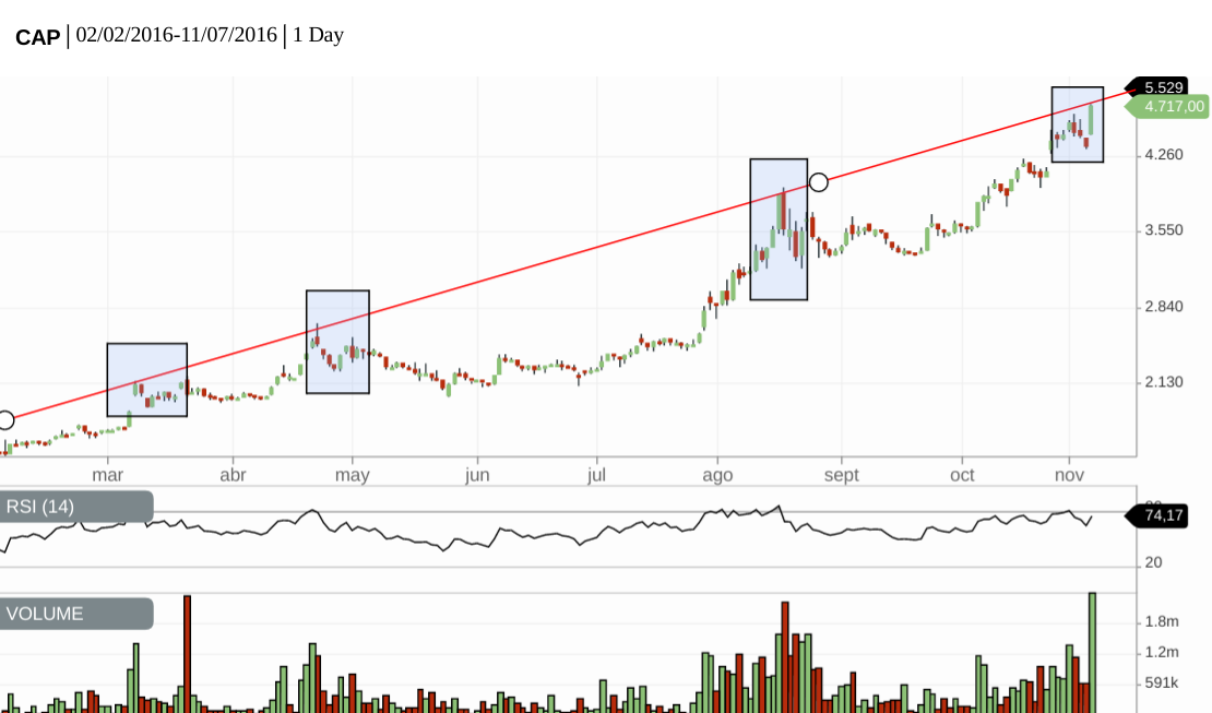 ... aunque así a la rápida me parece más bien una sucesión intermitente de alzas rápidas y canales horizontales, todo en un contexto de una tendencia alcista de mayor plazo ... aunque el alza desde inicios de octubre (de menor pendiente que la anterior ==> algo más fiable) tuvo una leve pausa (sin canal significativo) y siguió ... sigue, en realidad.