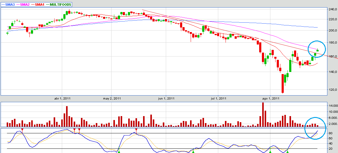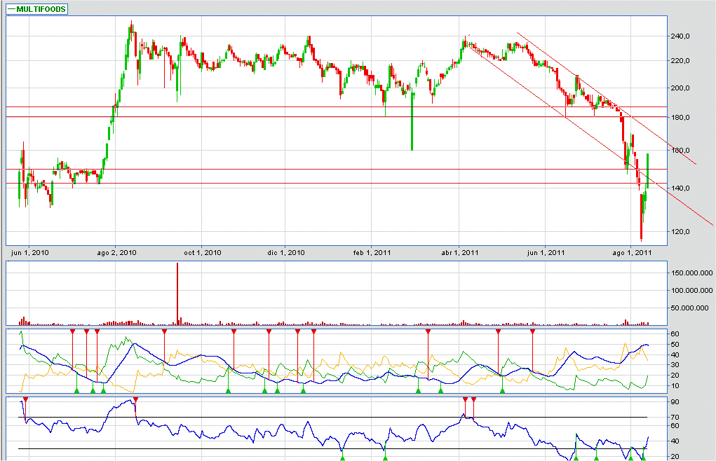 En los dos rebotes de comienzos de 2009, la acción rompió su media móvil de 30 días. En el primero de ellos, también pasó la de 45. Esta mañana, la acción de Multifoods casi tocó su media de 30 días.