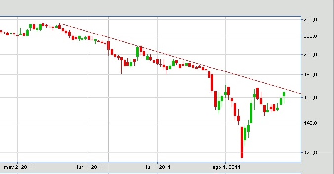 Si tratamos de aprender del pasado, tenemos dos alternativas: una es esperar que siga subiendo hasta acercarse a los $180, esto es, su media móvil de 45 días. La otra, más conservadora, indica que sería el momento de vender ahora (como algunos lo han hecho... cuando copié la imagen estábamos en $167 y ahora ya volvió a $161)... ambas opciones, suponiendo que nos hemos atrevido a comprar en este rebote (digo, el martes o a lo más el miércoles, esto último fue lo que hice yo, y acabo de vender a $163).