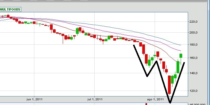 Ve este link adjunto en que se explica simple, en el caso de multi, si se da es un HCH invertido que si rompe se va al alza. La cabeza en el punto más bajo del gráfico del 8/08 y los hombros son los puntos de los cierres del 27/07 y 18/08.